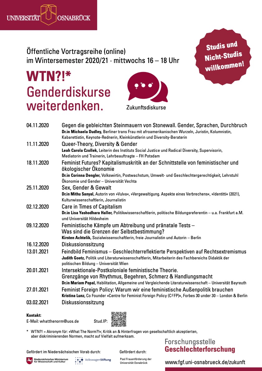 Im Rahmen des Projektes Zukunftsdiskurse bildete sich ein studentisches Projektteam, welches die interdisziplinäre Vortragsreihe „WTN?! (What The Norm?!) – Genderdiskurse weiterdenken“ geplant und im Wintersemester 2020/2021 durchgeführt hat. Die entstandene Reihe richtete sich an Studierende sowie an alle Personen mit Interesse an Geschlechterforschung.